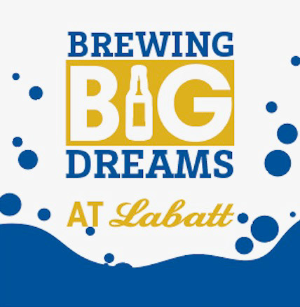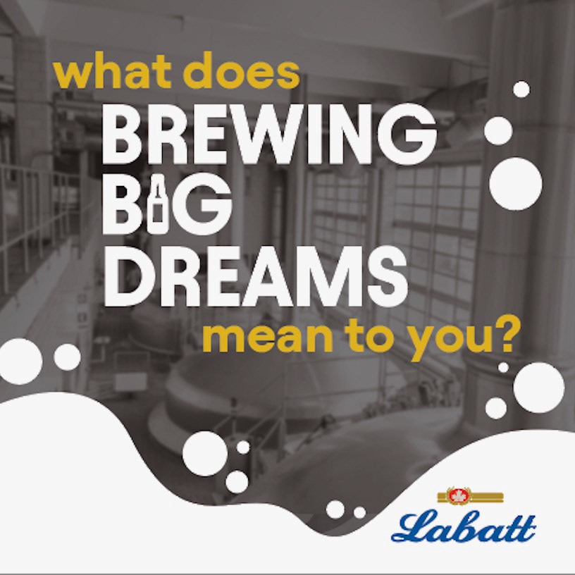 In this second iteration Labatt came back asking for more iconography as they were looking for something they could use to "brand" the program. They gave three main themes that we could go off of "Brewing Big Dreams", "Innovation on Tap" and "Cheers to you". Keeping these themes in mind, I did some research into how beer is made and thought about ways to implement beer into the graphics. After some experimentation, I came to the following results where the bubbly water became the main motif and while replacing common letters with beer bottles further solidified the theming.